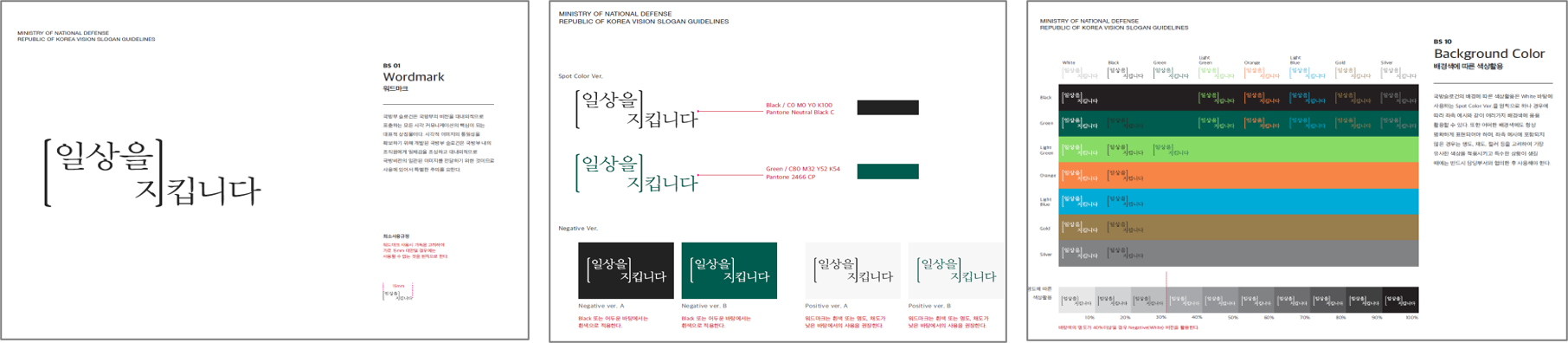 일관성 있는 홍보를 위한 핵심 메시지 및 브랜드 스토리를 정립하고자 BI를 제작했습니다. 이에 가독성 높고 담백한 명조체로 브랜드 로고를 디자인해 각인성을 제고했으며, 대괄호 [ ]를 활용해 국민이 지키고 싶은 일상의 이미지를 연상할 수 있도록 의미를 확장하는 등 국방부의 새로운 메시지의 명확함과 진정성을 담아냈습니다.
