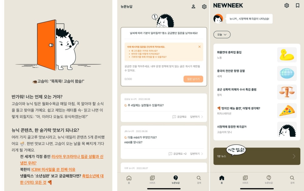 피글렛: 저는 뉴닉(newneek)이라는 뉴스레터를 정기 구독하고 있습니다. 뉴스레터마다 옷을 갈아입고 표정도 달라지는 고슴이를 두고 구독자들은 “고슴이 덕질한다”는 표현이 있을 정도로 귀여운 뉴닉의 마스코트 ‘고슴이’도 인기에 한 몫을 하고 있습니다. 주말을 제외한 매일 아침 이메일을 통해 내용이 전달되고, 홈페이지에서도 뉴스를 확인할 수 있습니다. 낚시성 기사 타이틀이 없는 카테고리별 양질의 최신 뉴스를 간결하고 쉽게 볼 수 있는 게 매력 포인트라고 생각합니다.