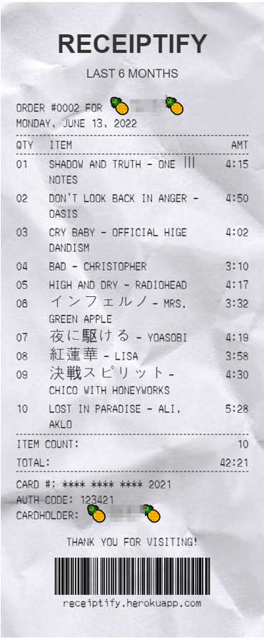 두 번째로 요즘 제 고막 메이트, 음원 스트리밍 서비스 ‘스포티파이’ 추천해드려요. 스포티파이는 다른 음원 사이트에 비해 다양한 플레이리스트를 구성할 수 있다는 것이 큰 장점인데요. 알고리즘에 따라 추천받은 음악들로 플레이리스트를 구성할 수 있을 뿐만 아니라 다른 사람들과 함께 내 플레이리스트를 채울 수 있어요. 특히나 유저가 좋아하는 음악과 유사한 음악들 추천을 잘해줘서 새로운 음악을 많이 발굴해갈 수 있어요. 이와 연계되어, Receiptify라는 사이트에서는 스포티파이 계정으로 로그인하면 많이 들은 음악을 영수증 형태로 리스트를 제공해 준답니다. 일명 ‘음악 영수증’이라고 하는데 트위터에서 RT를 타면서 화제가 되었다고 해요.