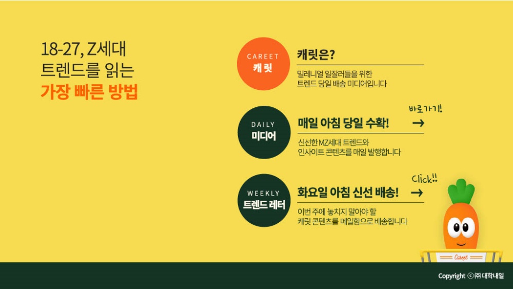 마지막으로는 뉴스레터입니다. 먼저, 제안서 써보신 피알워너라면 한 번쯤은 이용해 보셨을 법한 트렌드 당일 배송 미디어 ‘캐릿’을 가장 자주 들여다보고 있어요. 대학내일에서 만든 서비스인데 뉴스레터 구독도 하고 주 1회 이상 사이트 방문할 정도로 자주 이용해요. 마이크로 트렌드나 인사이트, 밈에 대해 쉽게 설명해 줘서 유용하고, MZ세대 관련 콘텐츠 기획이나 제안서 작성 시에 활용하기에도 좋아요. 주변 친구들도 잘 이용하고 있고 저희 팀 내에서도 대표 아이디로 멤버십 구독 중이랍니다!