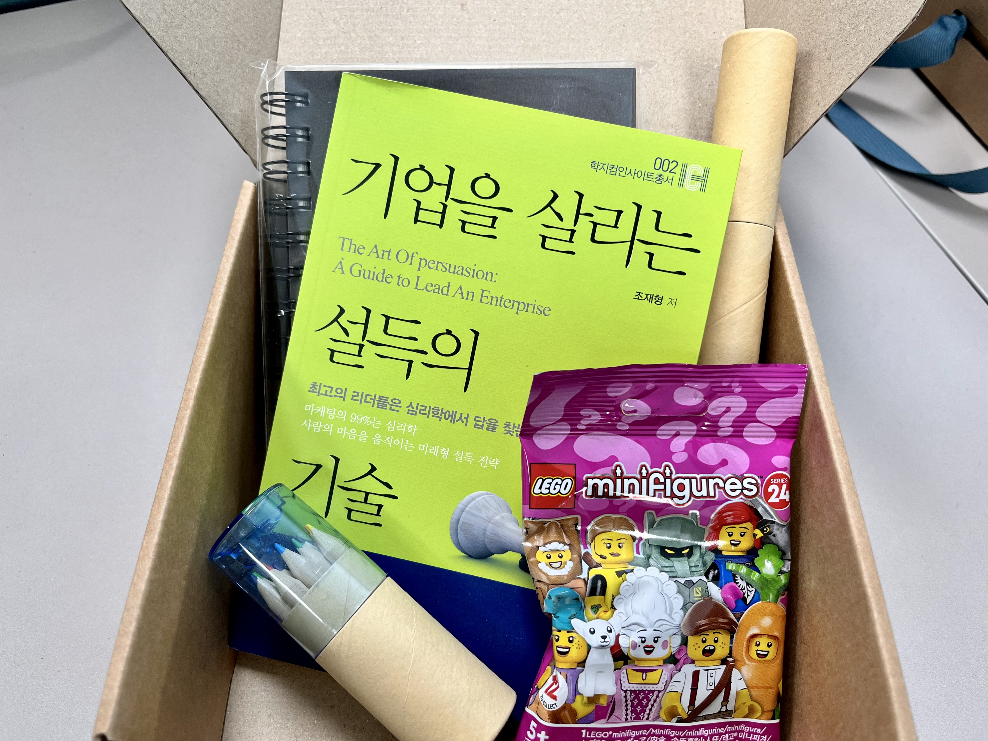 PR위원회 학생들 한명 한명의 이름이 들어간 웰컴키트에는 조재형 대표님의 저서인 <기업을 살리는 설득의 기술>과 피알원 공책, 필기구 세트, 미니레고 키트를 담았습니다. 간소한 선물이지만 앞으로의 PR인을 꿈꾸는 학생들을 위한 마음으로 정성껏 준비했습니다.