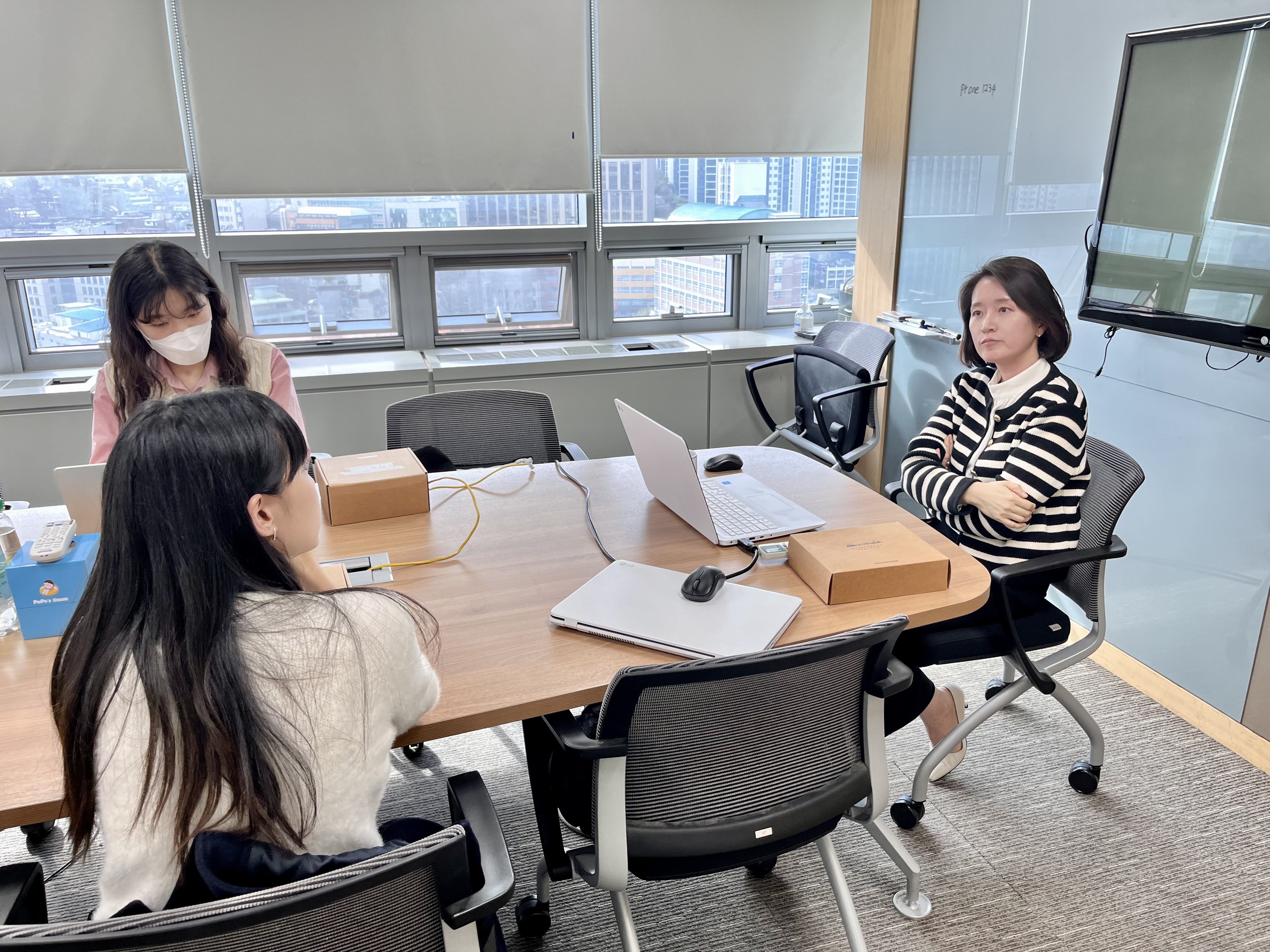 숏폼 콘텐츠 제작을 위해 학생들이 카메라를 켜고 피알원 사원들의 모습을 담고 있는데요. 카메라 앞에서 수줍은 미소를 띠던 피알워너들도 이내 진지한 모습으로 인터뷰에 응해주었습니다.