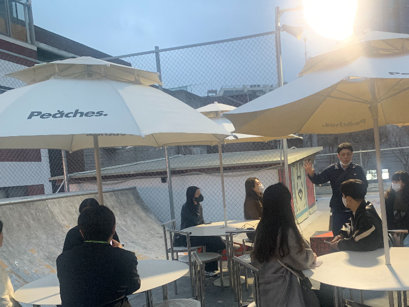 ‘피치스 도원’을 모두 둘러본 뒤, 루프탑 공간의 테이블에 앉아 함께 모인 피알워너들. 흥미롭고 인사이트 넘치는 내용들을 끝까지 열정적으로 설명하고 인솔해주신 백영선 대표님께 큰 박수를 전하며 각자 이번 투어를 통해 느낀 점을 공유하는 시간을 가졌는데요.