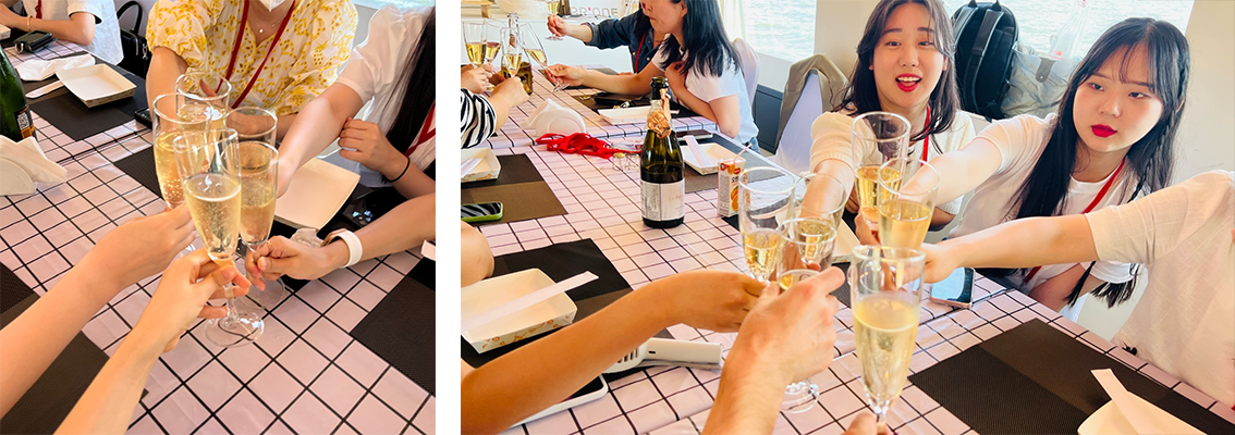 기다리던 요트를 탑승했습니다. 미리 준비 된 저녁식사와 함께 쓸모없는 선물 주고받기 등 소소한 기념행사를 즐겼는데요. 마리나 요트 안에서 팀원들과 함께 앉아 샴페인을 기울이며 즐기고 요트 위에서 사진도 찍으며 단합대회의 마지막까지 제대로 힐링하며 마무리할 수 있었습니다. 🚢🥂
