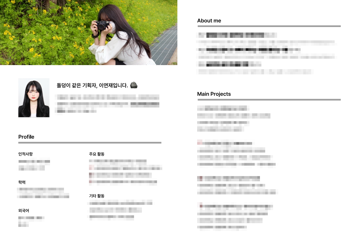 이렇게 자기소개서 작성을 마치고, 저는 포트폴리오를 제작하여 지원서와 함께 제출했는데요! 포트폴리오가 필수 제출 항목은 아니지만, 정해진 양식의 지원서와 달리 제 자신을 조금 더 입체적으로 보여줄 수 있는 기회라고 생각해 열심히 제작해 보았습니다. 내용은 지원서에 적어낸 활동들과 크게 다르지 않았으나 제가 활동한 과정에서 어떻게 기여했고, 어떤 역량을 길렀는지를 구체적으로 드러내기 위해 노력했어요!