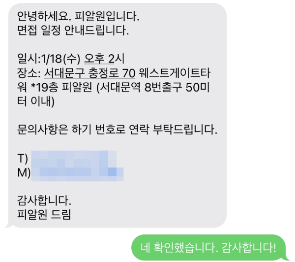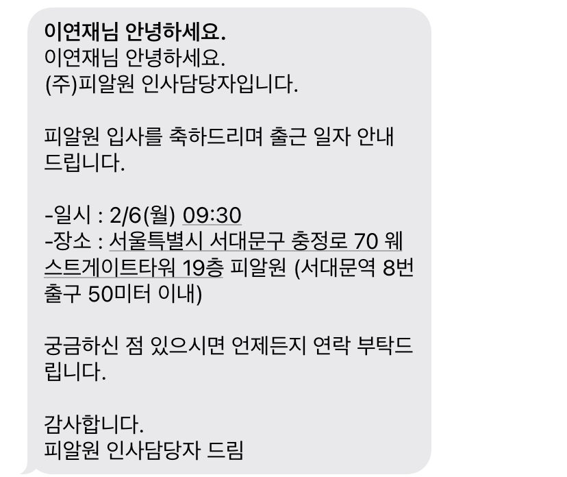 저는 설 연휴 직전에 면접을 봤던 관계로, ‘설 연휴가 지난 이후에 최종 결과가 발표될 예정이다’라고 사전 안내를 받았었는데요! 그 말씀에 방심한 채로 마음을 놓고 있던 와중, 놀랍게도 면접 바로 다음 날! 이른 최종 합격 문자를 받게 되었습니다.