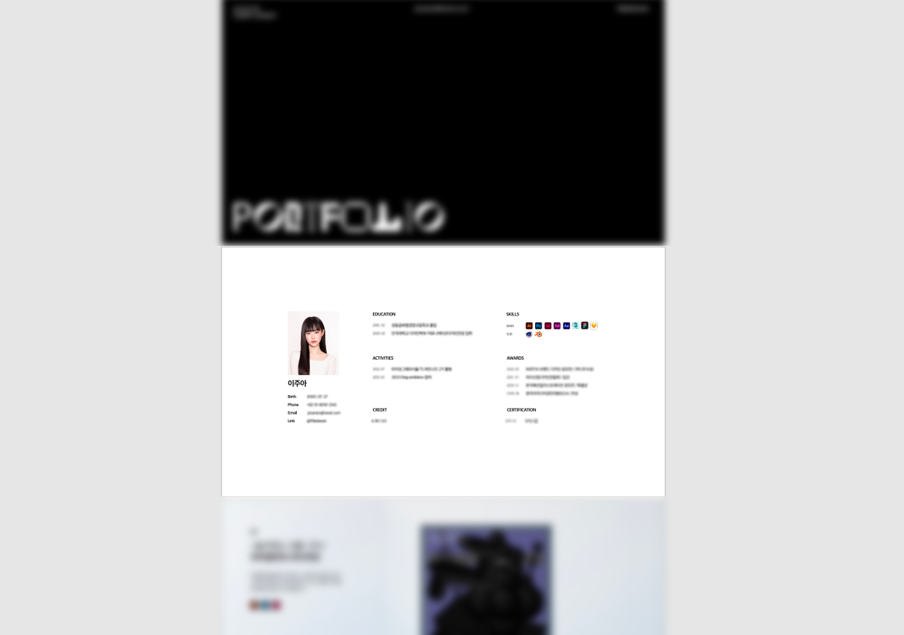 저는 휴학을 하기 전부터 제 작업물을 정리하여 제작한 포트폴리오가 있었는데요! 이렇게 미리 정리해놓은 덕분에 기존에 작업했던 작품들을 수정, 보완하는 정도로 수월하게 준비할 수 있었습니다.