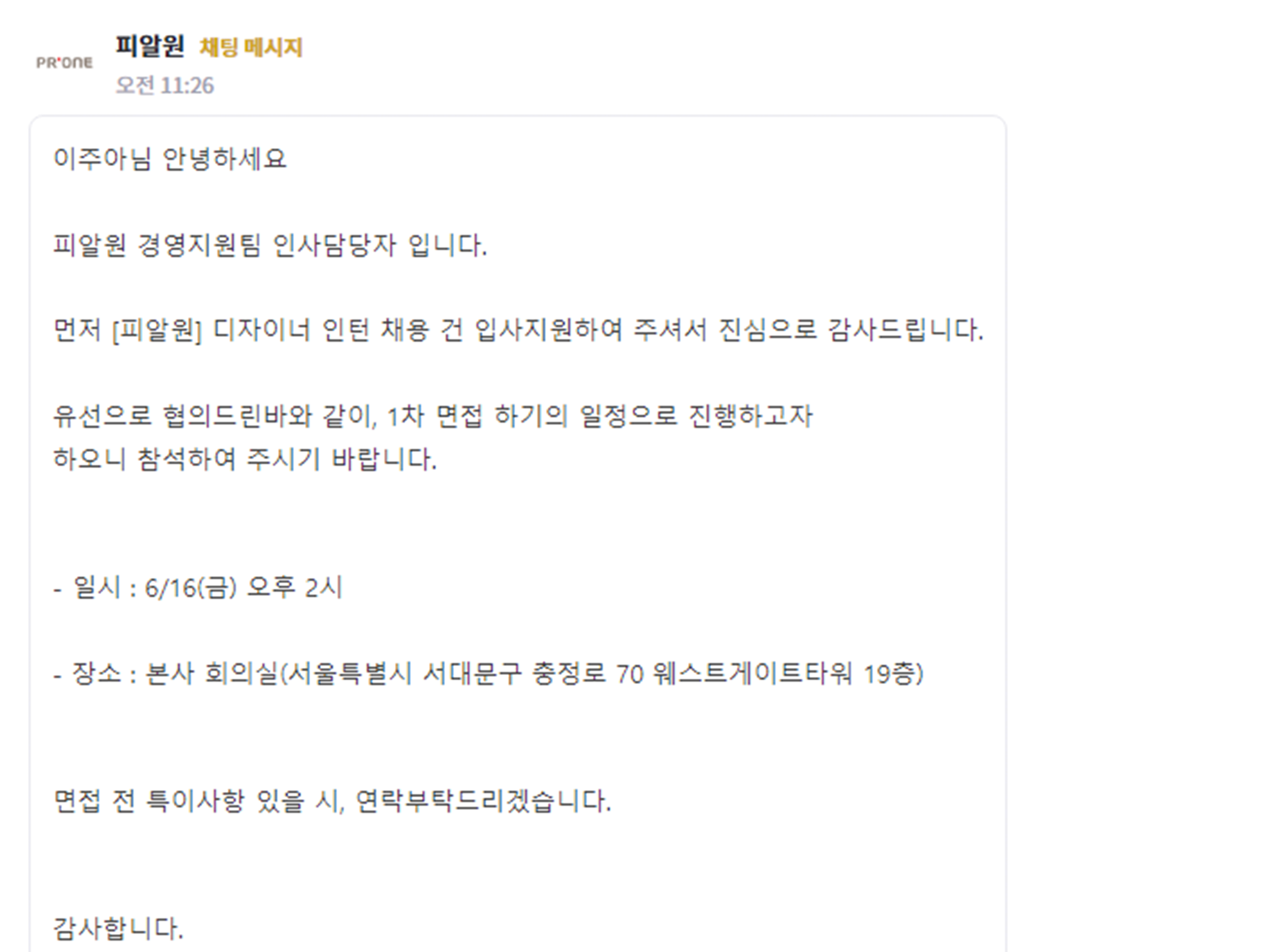 면접은 피알원 사무실 19층에서 이뤄졌습니다. 피알원 사무실을 처음 방문하였는데, 서대문역에 내리면 바로 찾아갈 수 있어서 너무 편했던 기억이 납니다!! 면접을 안내해 주시던 경영지원팀 선배님께서 음료수를 주시면서 친절하게 대해주셔서 편하게 대기할 수 있었던 것 같아요!