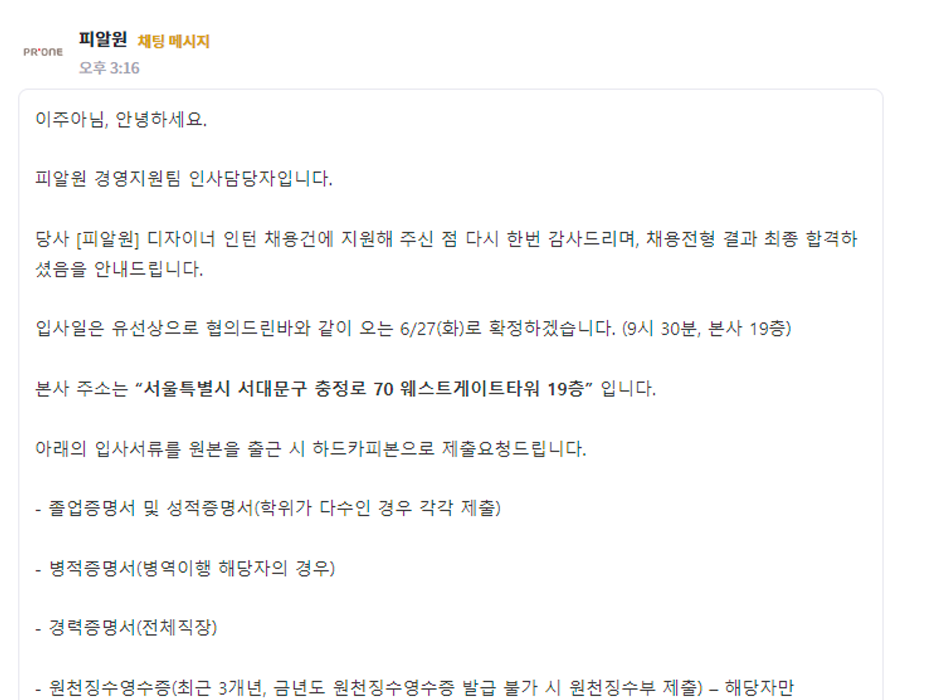 지금까지 제가 피알원 인턴을 준비하는 과정을 전해드렸는데요~ 피알원에 지원하는 인턴 및 입사 희망자분들께 조금이나마 도움이 되었으면 좋겠습니다! 다음 인턴일지에서는 DCS팀 인턴의 하루에 대해 소개해드릴 예정이니 많은 기대 부탁드립니다! 감사합니다~