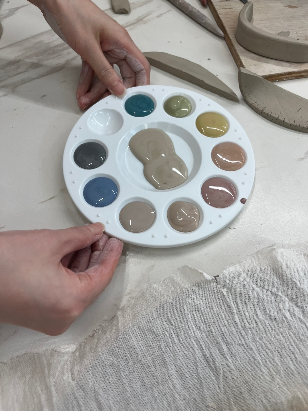 클래스에 대한 만족감이 높아지면서 보다 다양한 형태의 수업도 도전해 볼 수 있었습니다. 가장 최근에는 핸드빌딩으로 만든 기물 위에 채색을 하는 클래스도 진행했는데요, 한껏 물감에 적신 붓을 털어 방울방울 무늬를 만드는 기법부터 직접 그림을 그리는 기법까지 이 또한 세라미스트들의 개성에 맞춰 직접 선택해 진행했습니다.