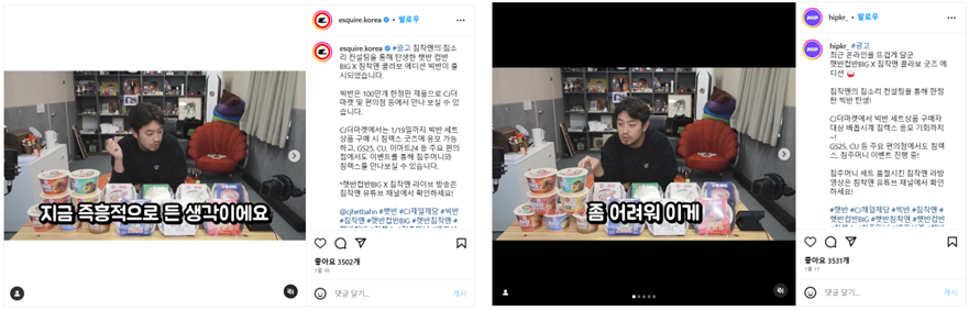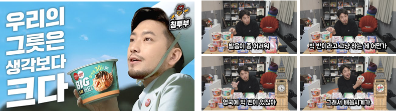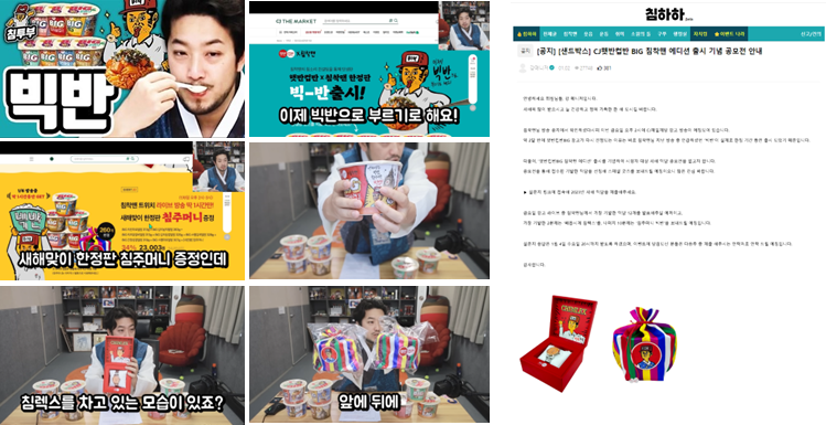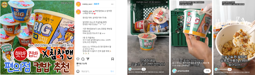 또한 빅반과 침착맨의 제휴가 라이브 방송으로 진행되는 점을 고려하여 방송 이후에도 해당 이슈가 꾸준히 바이럴 되어 마케팅 효과를 지속할 수 있도록 인스타그램 파워페이지와 푸드 카테고리의 유튜브 채널 등과 제휴하여 햇반컵반BIG의 인지도와 호감도를 제고했습니다.