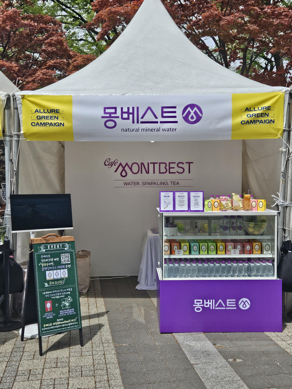 브랜드 컬러인 보라색을 포인트로 한 몽베스트 부스는 12가지의 몽베스트 블랜딩 하우스 제품과 다양한 티를 담은 형형색색의 무라벨 생수를 진열해 고객들의 눈길을 사로잡았는데요. 특히, 몽베스트의 무라벨 생수인 ‘위드 어스’는 그린 얼루어 캠페인의 취지에 맞는 친환경 제품이면서 20℃가 넘는 무더운 날씨 속에서 고객들의 갈등을 해소해 줘 큰 호응을 얻었습니다.