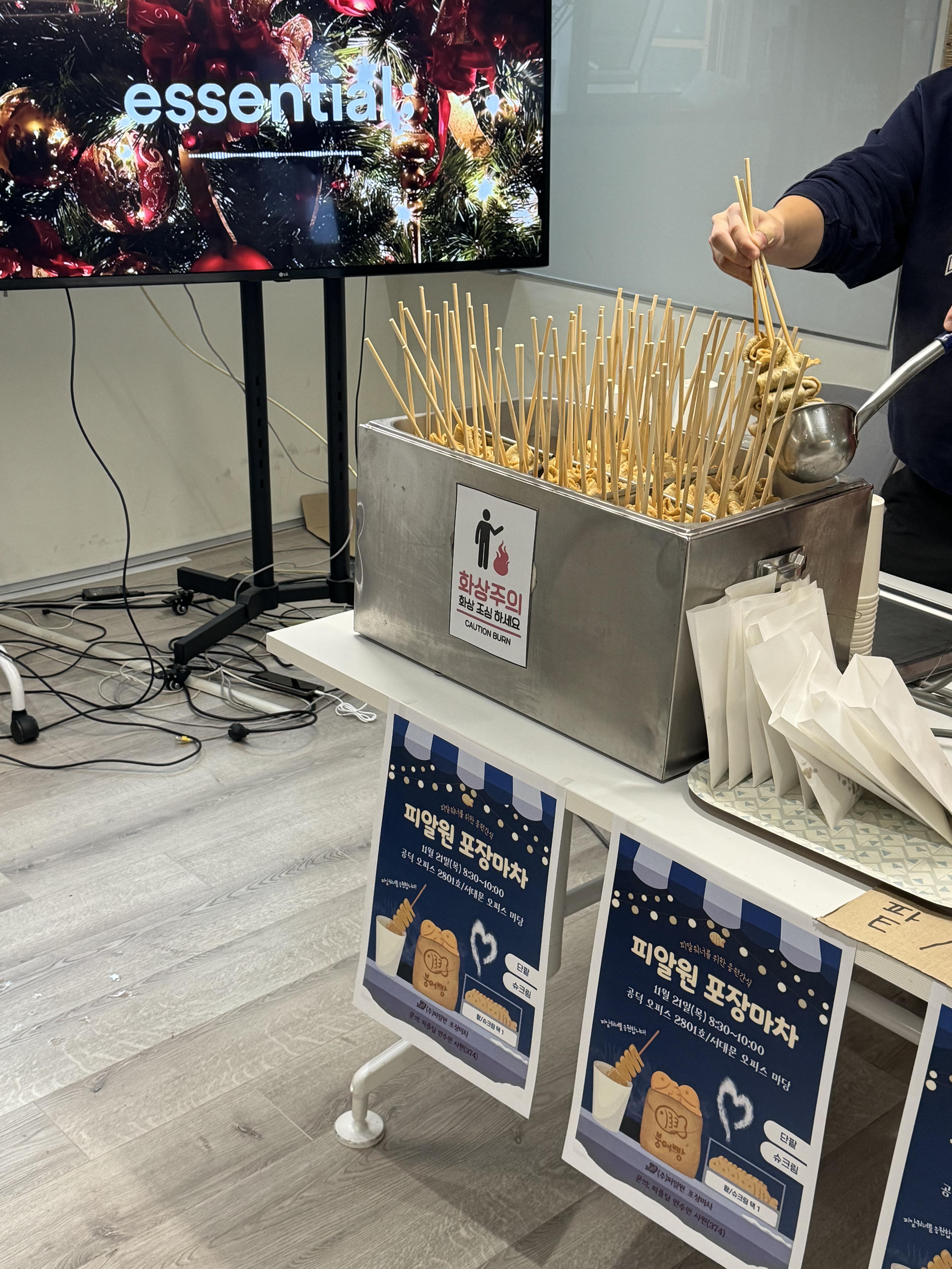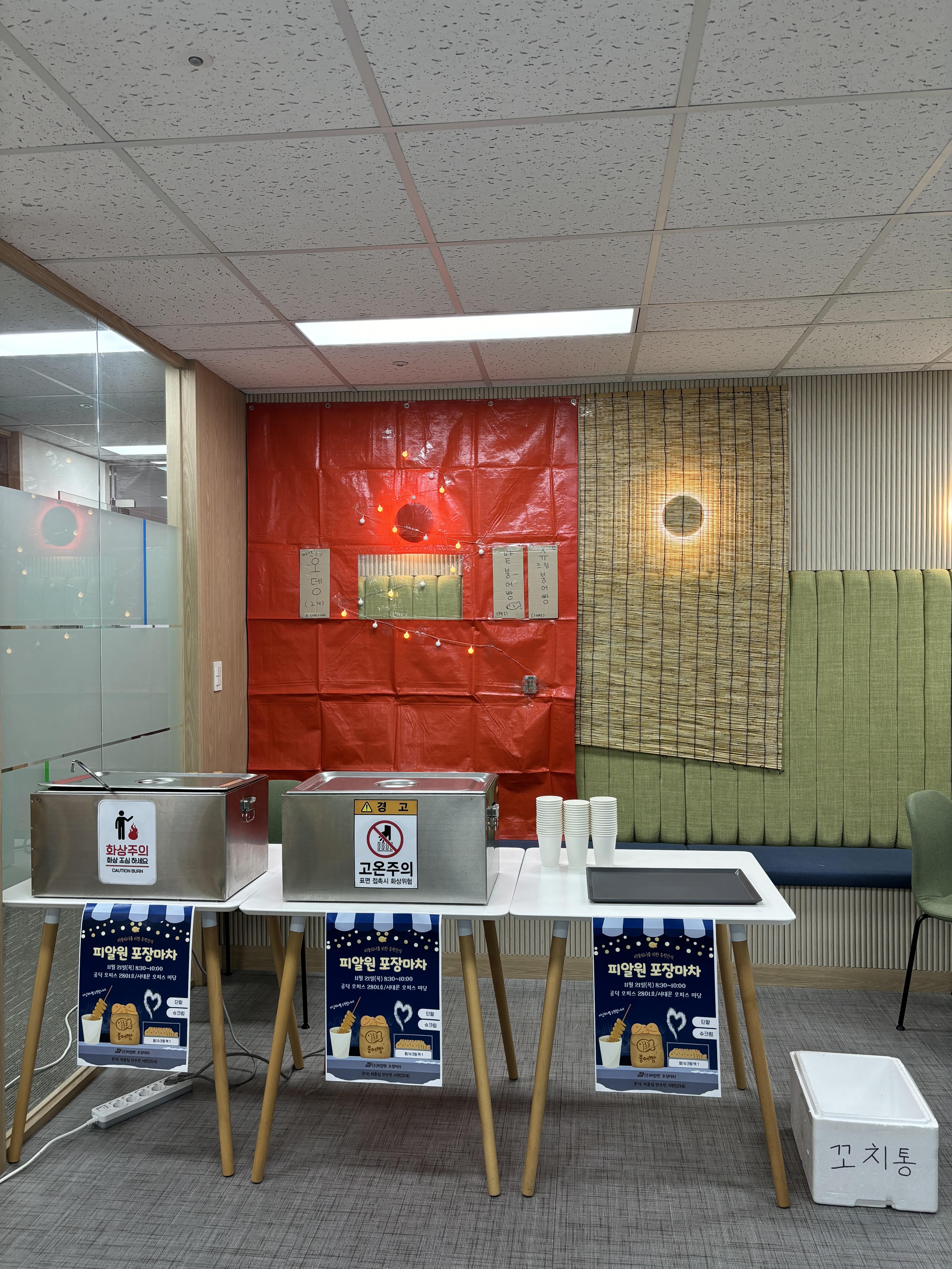 이번 행사의 포인트는 두 가지였는데요, ‘콘셉트의 명확함’과 절대 놓칠 수 없는 ‘맛’이었습니다. 포장마차 콘셉트를 잡아 겨울의 느낌을 구현하고, 업소용 어묵 기계와 맛으로 유명한 붕어빵을 구매해 피알워너들에게 맛있는 간식을 제공하고자 했습니다.