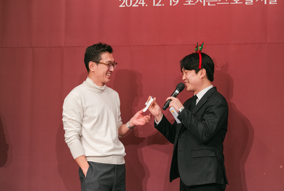 올해 송년회 진행은 김태영 차장님, 이하진 과장님께서 맡아주셨습니다! 올해 송년회가 무사히 잘 마칠 수 있도록 최고의 진행으로 이끌어주신 두 분께 이 자리를 빌려 감사의 인사를 드립니다. 😊