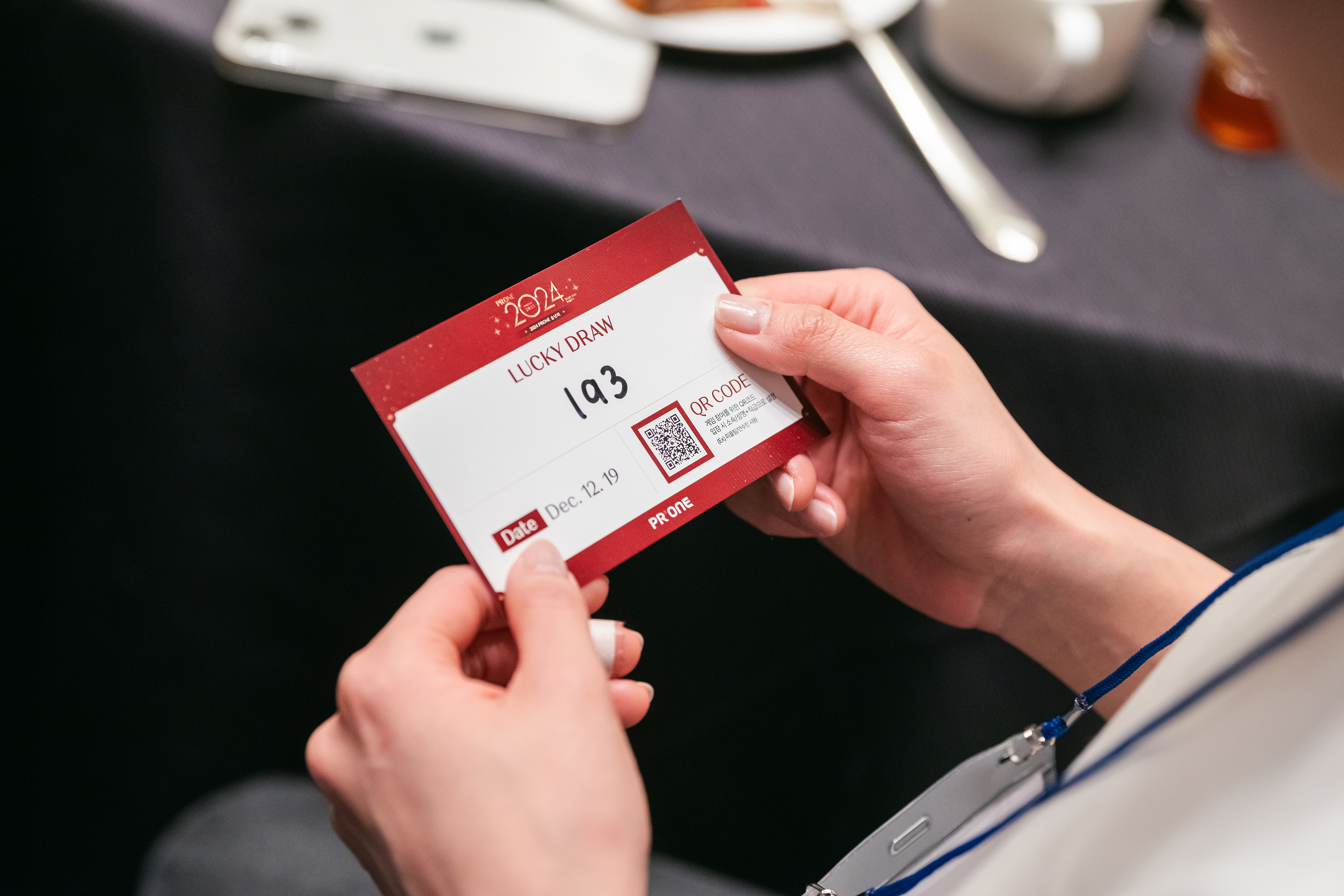 입장 시 안내데스크에서는 럭키드로우 티켓을 받을 수 있었는데요, 2024 송년회 컨셉에 맞춰 제작된 럭키드로우에는 행운의 숫자가 적혀있었습니다. 두근두근 떨리는 럭키드로우 시간..!