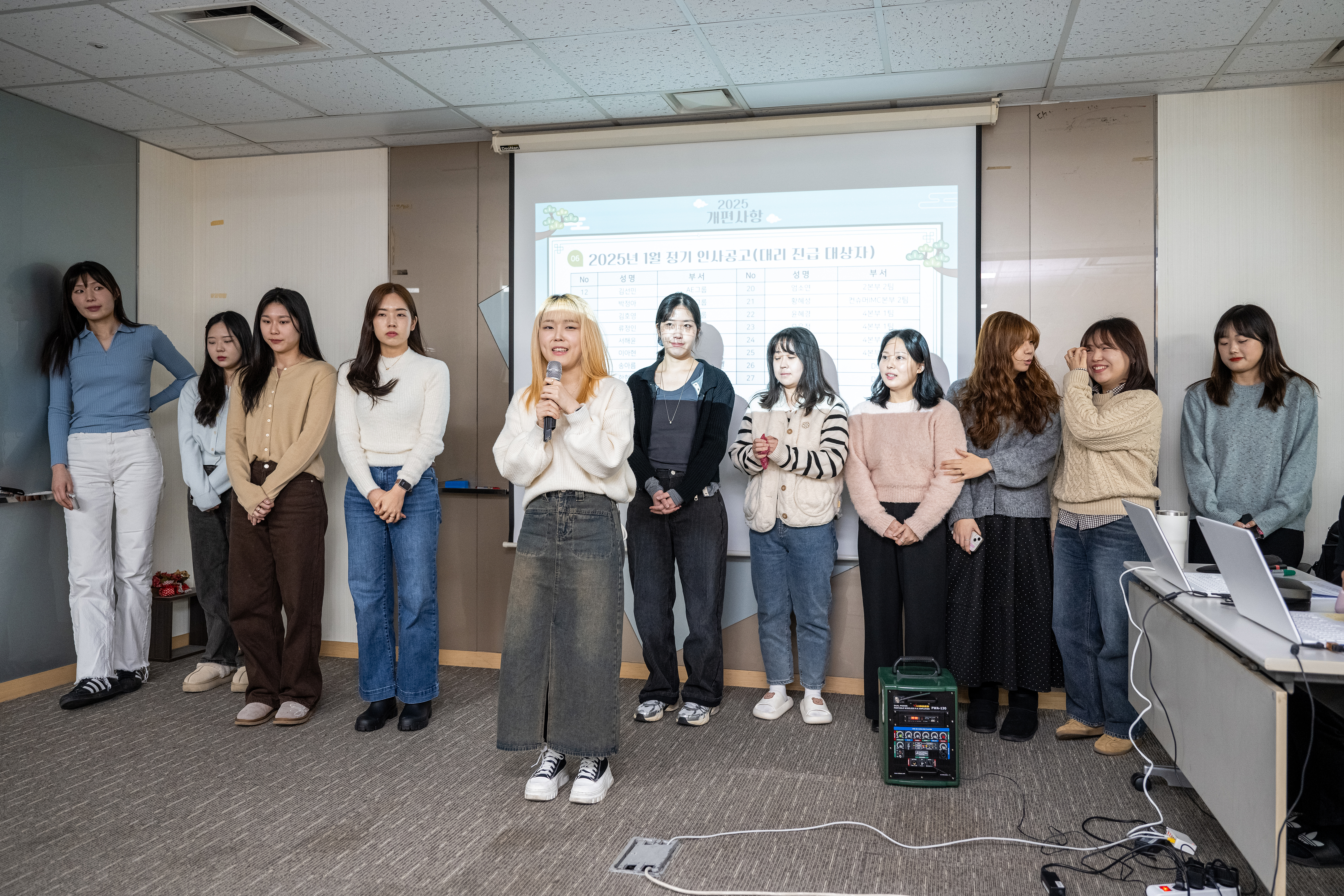 오승준 팀장님의 개편사항 안내 이후 2025년 1월 승진자들에 대한 소개 및 소감 발표가 이어졌습니다.