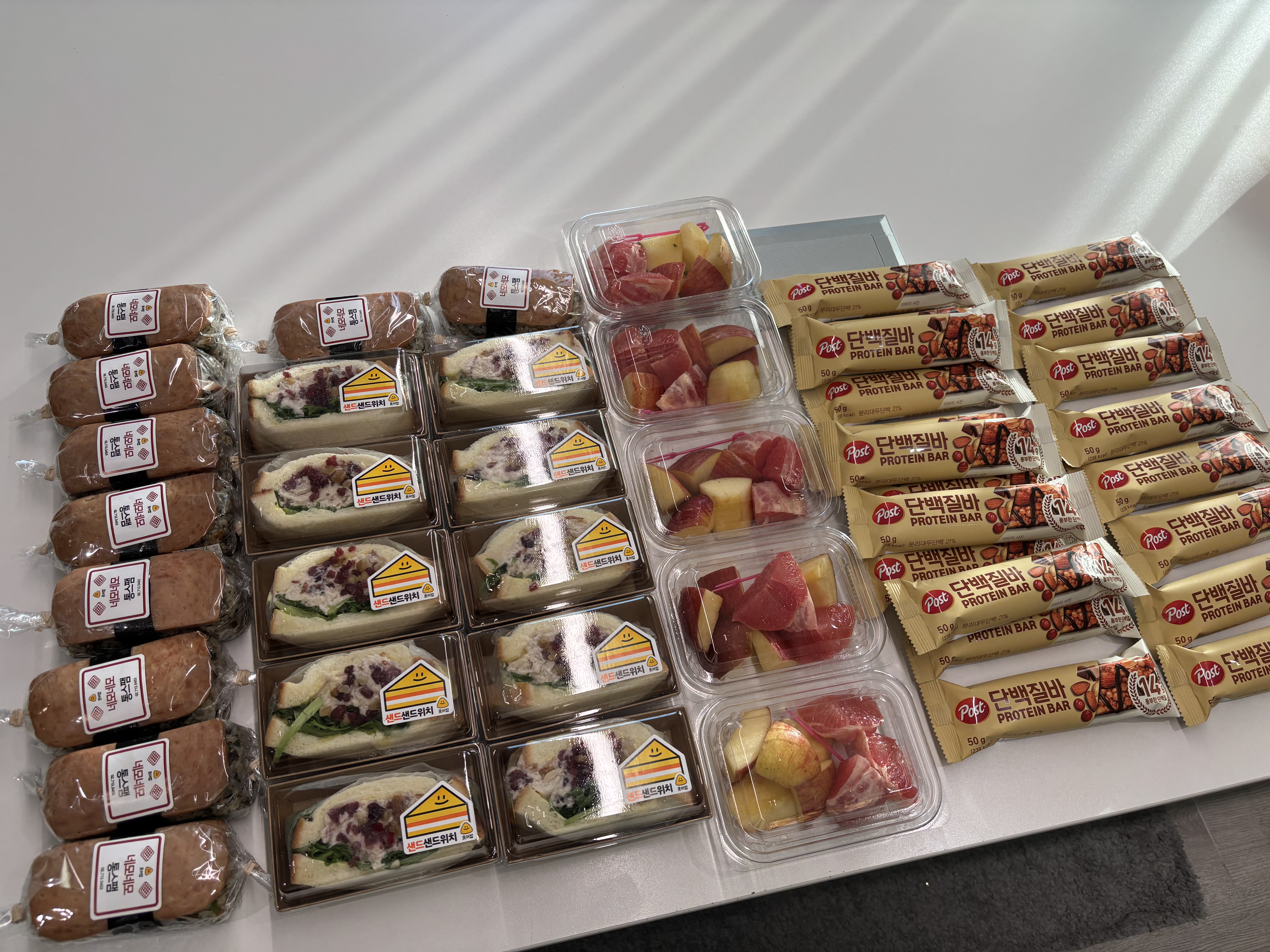 스팸 주먹밥, 샌드위치, 과일팩, 에너지바로 총 4가지 종류의 조식을 준비해서 피알워너들이 선호하는 조식을 고를 수 있도록 세팅했습니다.