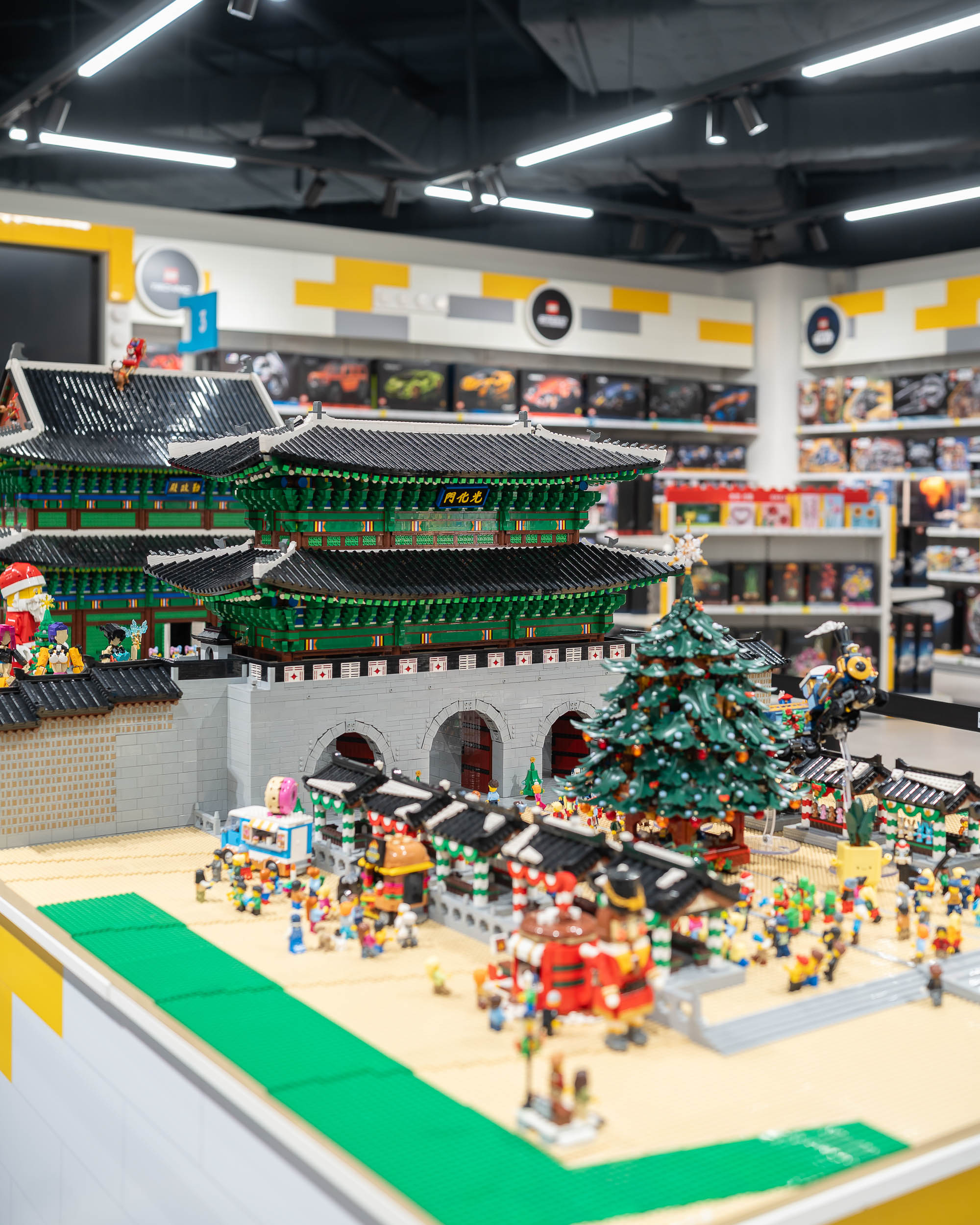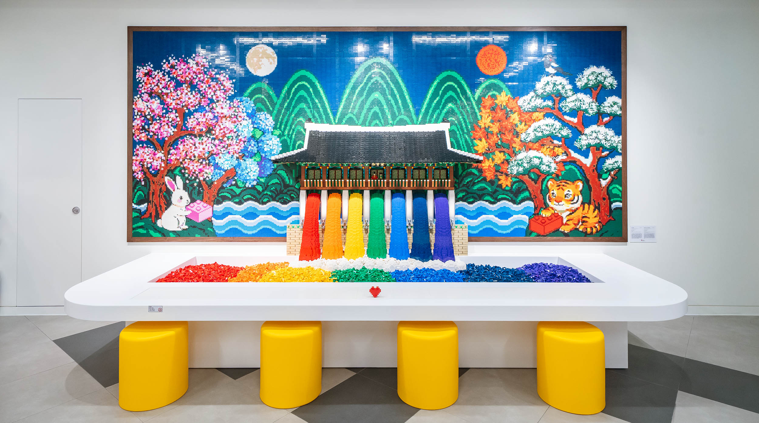 매장 안으로 들어서면 대형 레고 작품들이 단번에 시선을 사로잡는데요. 가로 약 5m에 달하는 ‘일월오봉도’ 레고 모자이크를 비롯해, 약 18만 5천 개의 브릭으로 완성한 ‘광화문과 근정전’ 디오라마, 광장시장을 모티브로 한 작품까지. 한국적인 풍경을 특유의 즐겁고 창의적인 감각으로 재해석한 작품들이 매장을 가득 채우고 있습니다.